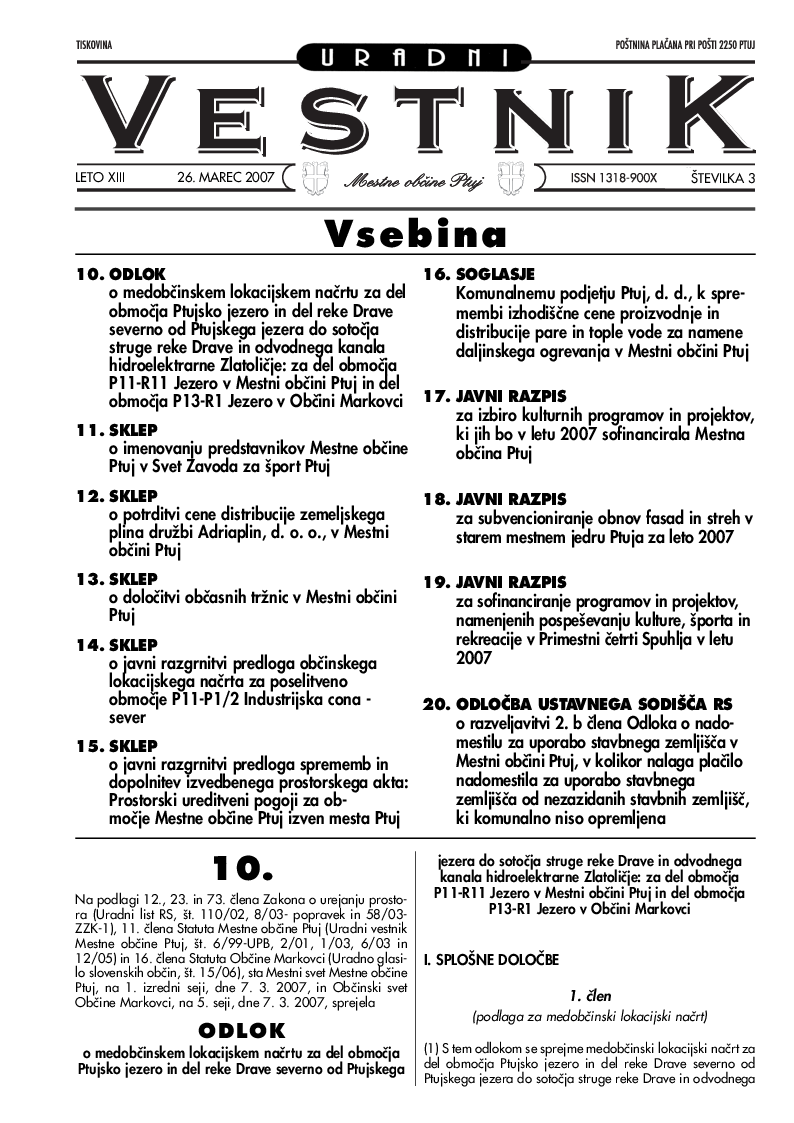 Odlok o medobčinskem lokacijskem načrtu za del območja Ptujsko jezero in del reke Drave severno od Ptujskega jezera do sotocja struge reke Drave in odvodnega kanala hidroelektrarne Zlatolicje: za del območja P11-R11 Jezero v Mestni občini Ptuj in del območja P13-R1 Jezero v Občini Markovci (Uradni vestnik Mestne občine Ptuj, št. 3/2007)