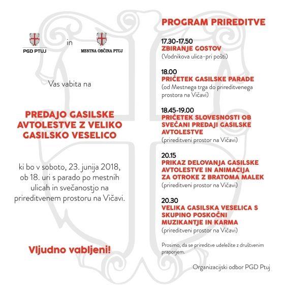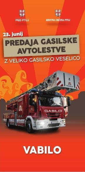 Vljudno vabljeni vas na slovesno predajo gasilske avtolestve PGD Ptuj, ki bo v soboto, 23. junija 2018, z začetkom ob 18. uri z gasilsko parado v središču mesta, tej bo sledila slovesnost na prireditvenem prostoru na Vičavi.