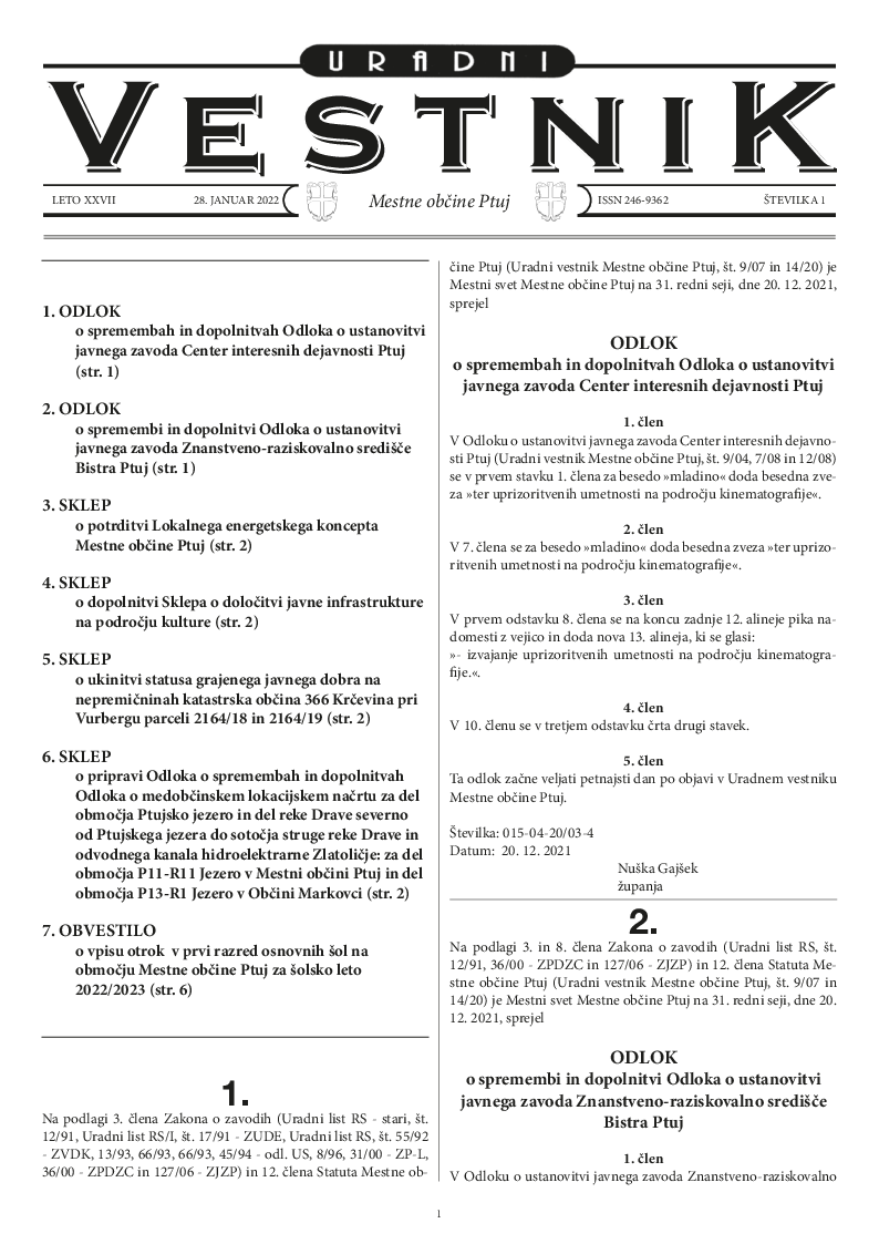 URADNI VESTNIK MESTNE OBČINE PTUJ, ŠT. 1/2022
