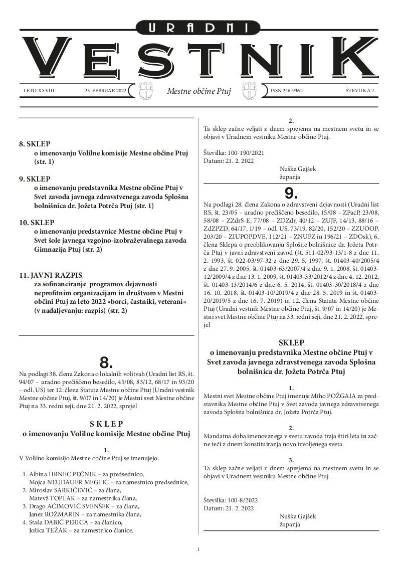 Sklep o imenovanju predstavnika Mestne občine Ptuj v Svet zavoda javnega zdravstvenega zavoda Splošna bolnišnica dr. Jožeta Potrča Ptuj (URADNI VESTNIK MESTNE OBČINE PTUJ, ŠT. 2/2022)