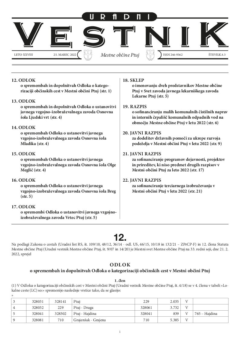 Odlok o spremembah in dopolnitvah Odloka o kategorizaciji občinskih cest v Mestni občini Ptuj (URADNI VESTNIK MESTNE OBČINE PTUJ, ŠT. 3/2022)