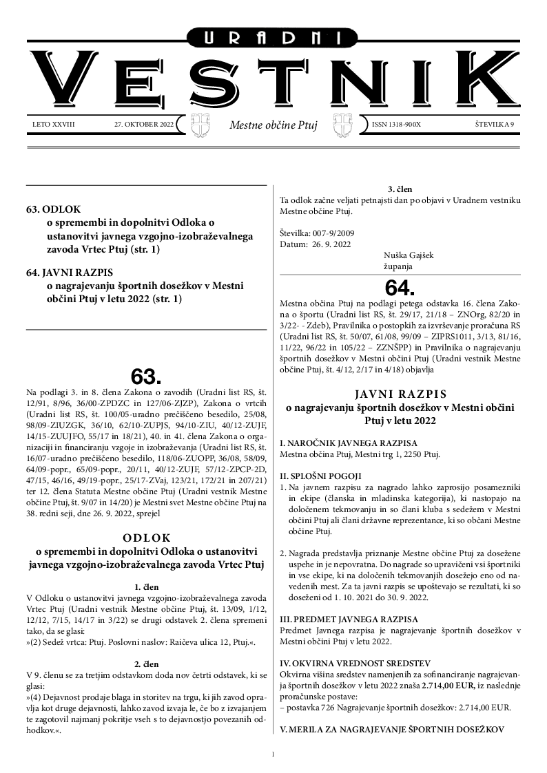 URADNI VESTNIK MESTNE OBČINE PTUJ, ŠT. 9/2022
