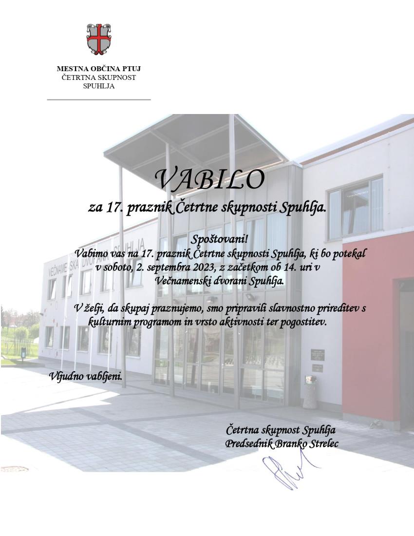 Vabimo vas na 17. praznik Četrtne skupnosti Spuhlja, ki bo potekal v soboto, 2. septembra 2023, z začetkom ob 14. uri v Večnamenski dvorani Spuhlja.
