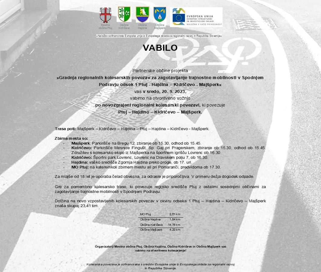 Partnerske občine projekta »Gradnja regionalnih kolesarskih povezav za zagotavljanje trajnostne mobilnosti v Spodnjem Podravju odsek 1 Ptuj - Hajdina – Kidričevo - Majšperk« vas v sredo, 20. 9. 2023, vabimo na otvoritveno vožnjo po novozgrajeni regionalni kolesarski povezavi, ki povezuje Ptuj – Hajdino – Kidričevo – Majšperk.