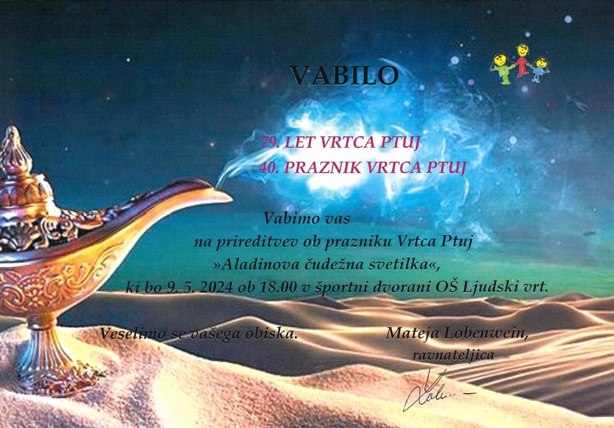 Vrtec Ptuj bo s prireditvijo z naslovom »Aladinova čudežna svetilka« obeležil svoj 40. praznik in 79 let delovanja zavoda. Prireditev bo v četrtek, 9. maja 2024, ob 18. uri v športni dvorani OŠ Ljudski vrt.