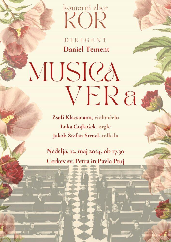 Komorni zbor Kor z dirigentom Danielom Tementom prireja koncert z naslovom Musica Vera, ki bo v nedeljo, 12. maja 2024, ob 17.30 v cerkvi sv. Petra in Pavla na Ptuju. Na koncertu sodelujejo glasbeni gosti Luka Gojkošek (orgle), Zsofi Klacsmann (violončelo) in Jakob Štefan Štrucl (tolkala).