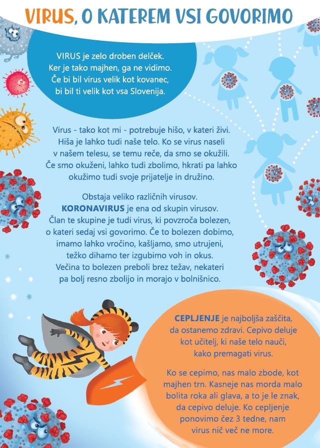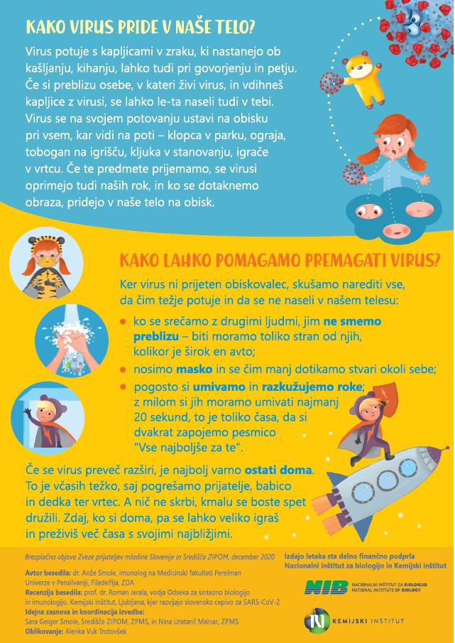 Ker so v Zvezi prijateljev mladine Slovenije zaznali, da so informacije o pandemiji namenjene predvsem odraslim, otroci pa ostajajo izpuščeni (odvisni so od podatkov, ki jim jih posredujejo bodisi starši bodisi učitelji ali pa jih sami najdejo na spletu), so pripravili otrokom prijazno gradivo, ki orisuje širšo sliko delovanja človeškega telesa v boju proti virusom ter hkrati podaja ključne informacije o trenutnem koronavirusu SARS-CoV-2.