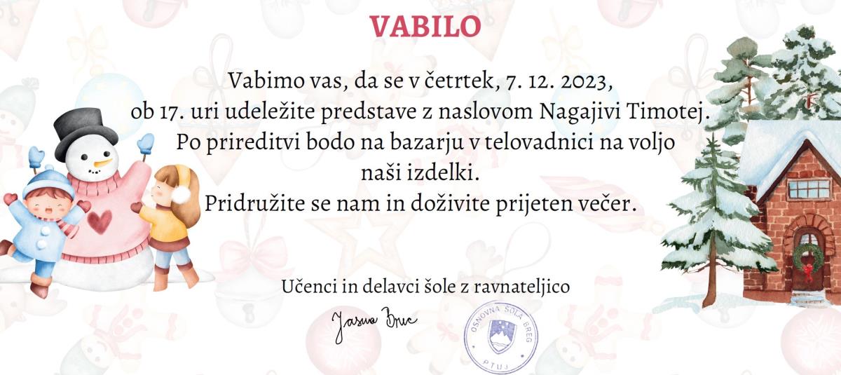 Prijazno vas vabimo na božično - novoletno prireditev z dobrodelnim bazarjem, ki bo v četrtek, 7. 12. 2023, ob 17.00 uri, v telovadnici OŠ Breg.